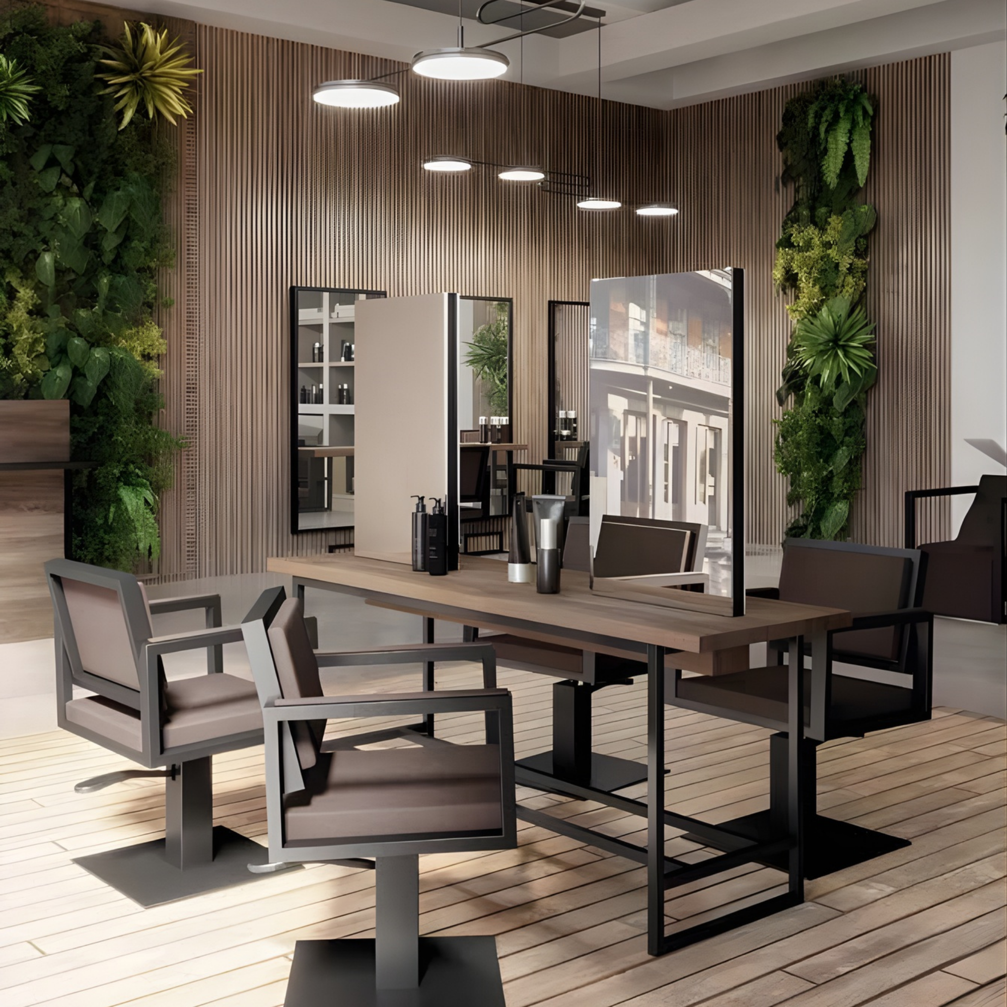 Zahvaljujući središnjem otočnom dizajnu, omogućuje istovremeni rad s više klijenata i učinkovito korištenje prostora, uz prepoznatljivu kombinaciju robustne metalne strukture i profinjenih drvenih tonova.