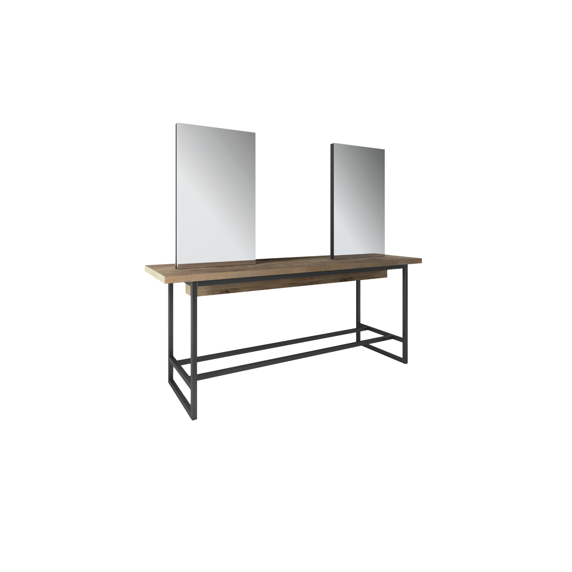 Radno mjesto Industrial Island dvostrana je središnja radna stanica namijenjena frizerskim salonima koji njeguju moderan, industrijski stil. Konstrukcija izrađena od mat crno lakiranog željeza pruža stabilnost i izražajnu estetsku notu, dok radna ploha od laminata s efektom drveta unosi toplinu i prirodan kontrast u prostor.