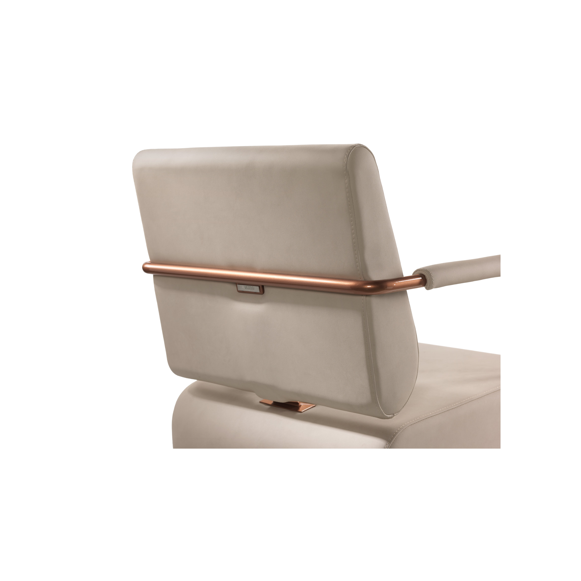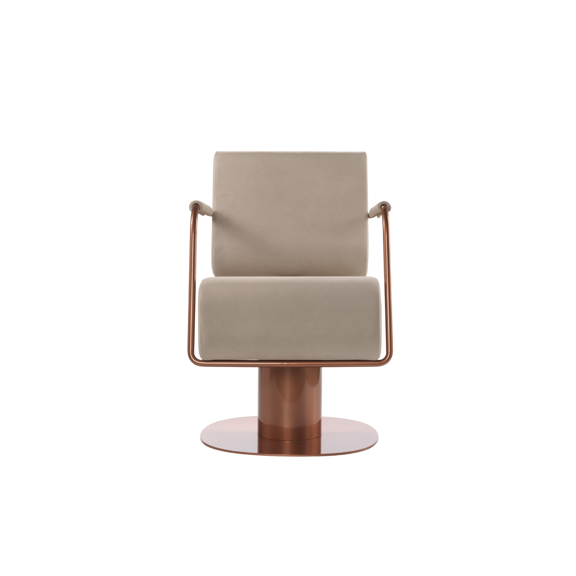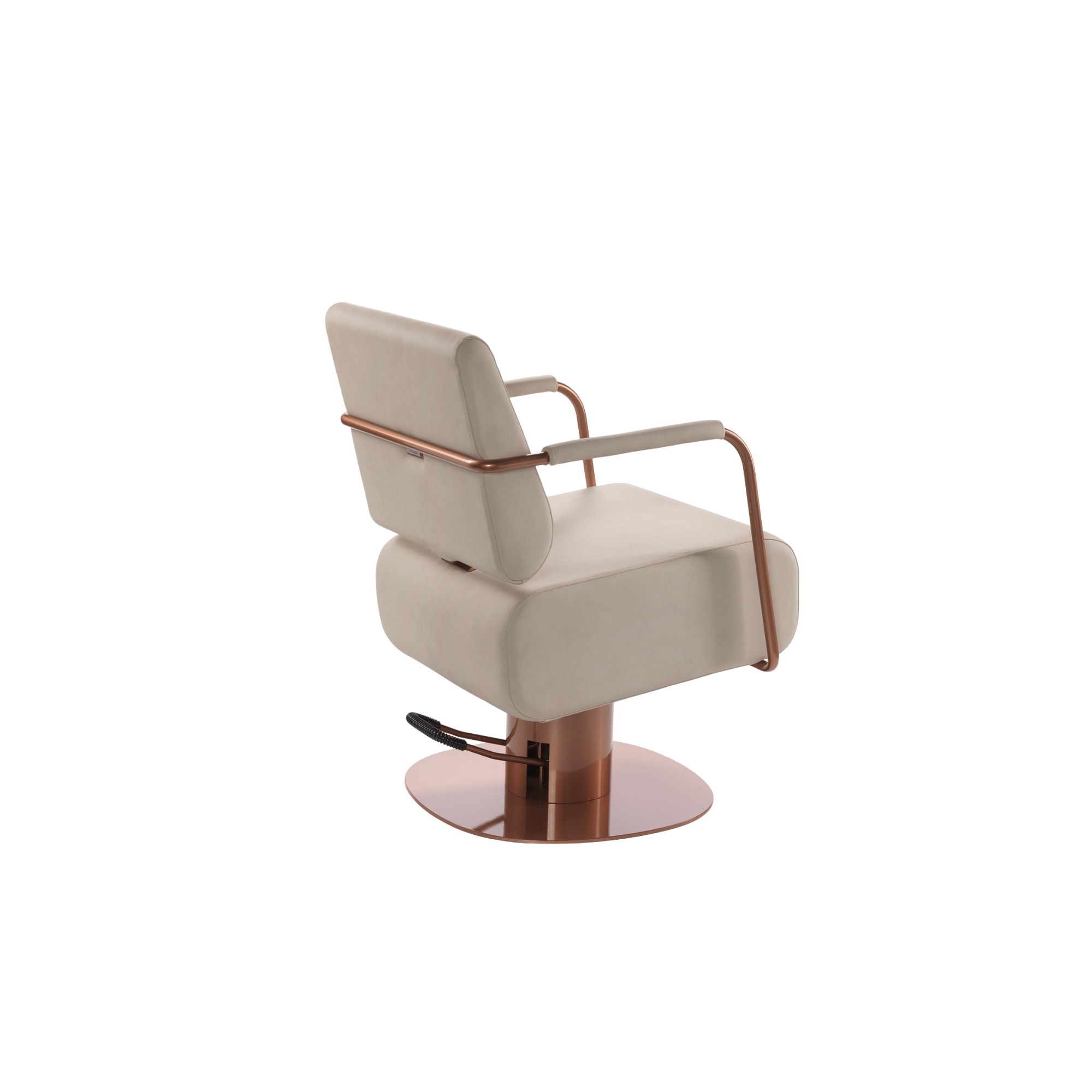Frizerska stolica kolekcije CU29 donosi moderan, elegantan i luksuzan izgled svakom salonu. S konstrukcijom i naslonima za ruke izrađenim od metala u boji bakra, ova frizerska stolica savršeno kombinira sofisticiran dizajn i funkcionalnost.