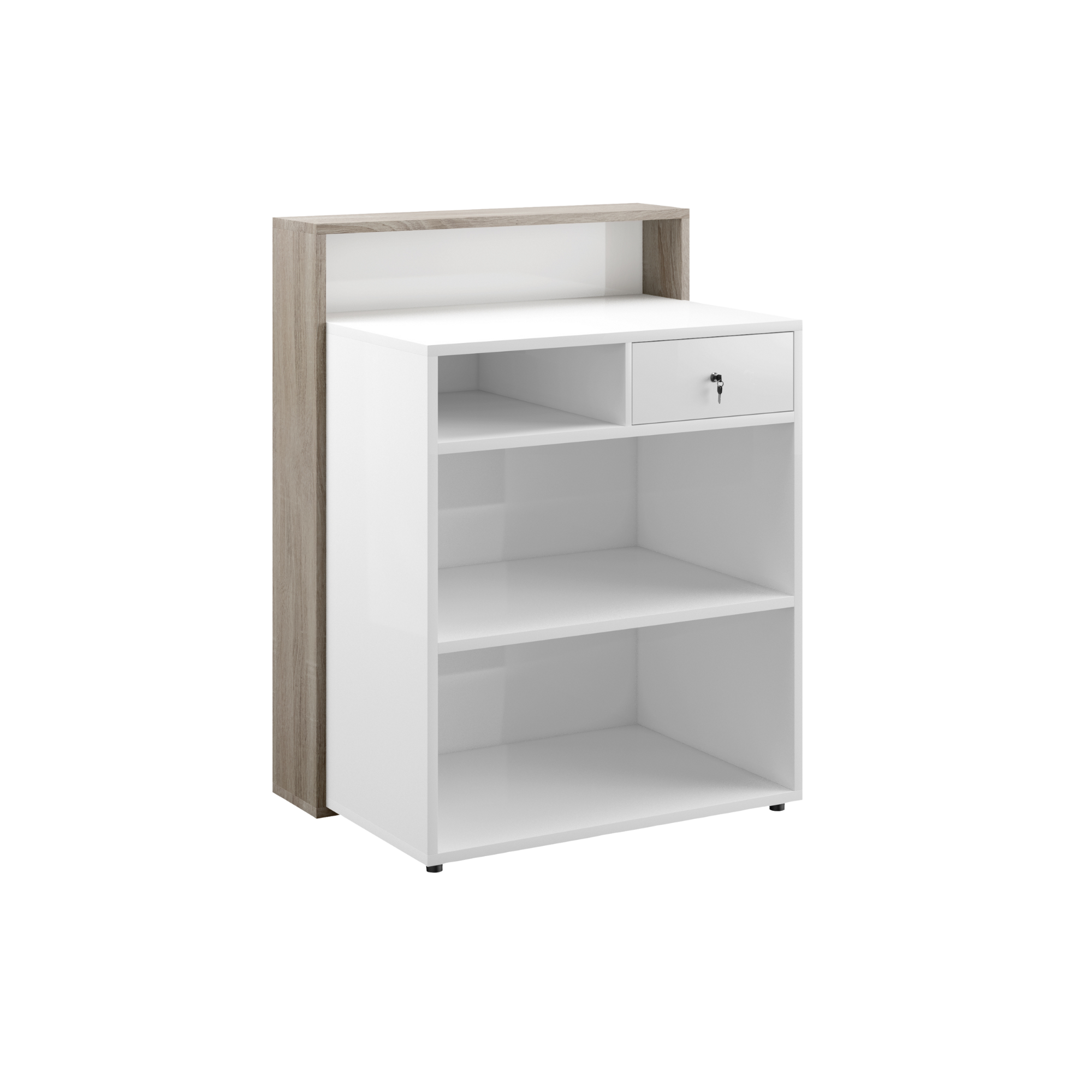 Recepcija Dorian izrađena je od melamina u boji po izboru i opremljena pozadinskim LED osvjetljenjem koje osigurava bolju vidljivost prednjeg panela. Konstrukcija je stabilna, s prostranom radnom površinom i unutarnjim policama koje omogućuju urednu organizaciju dokumentacije i opreme.