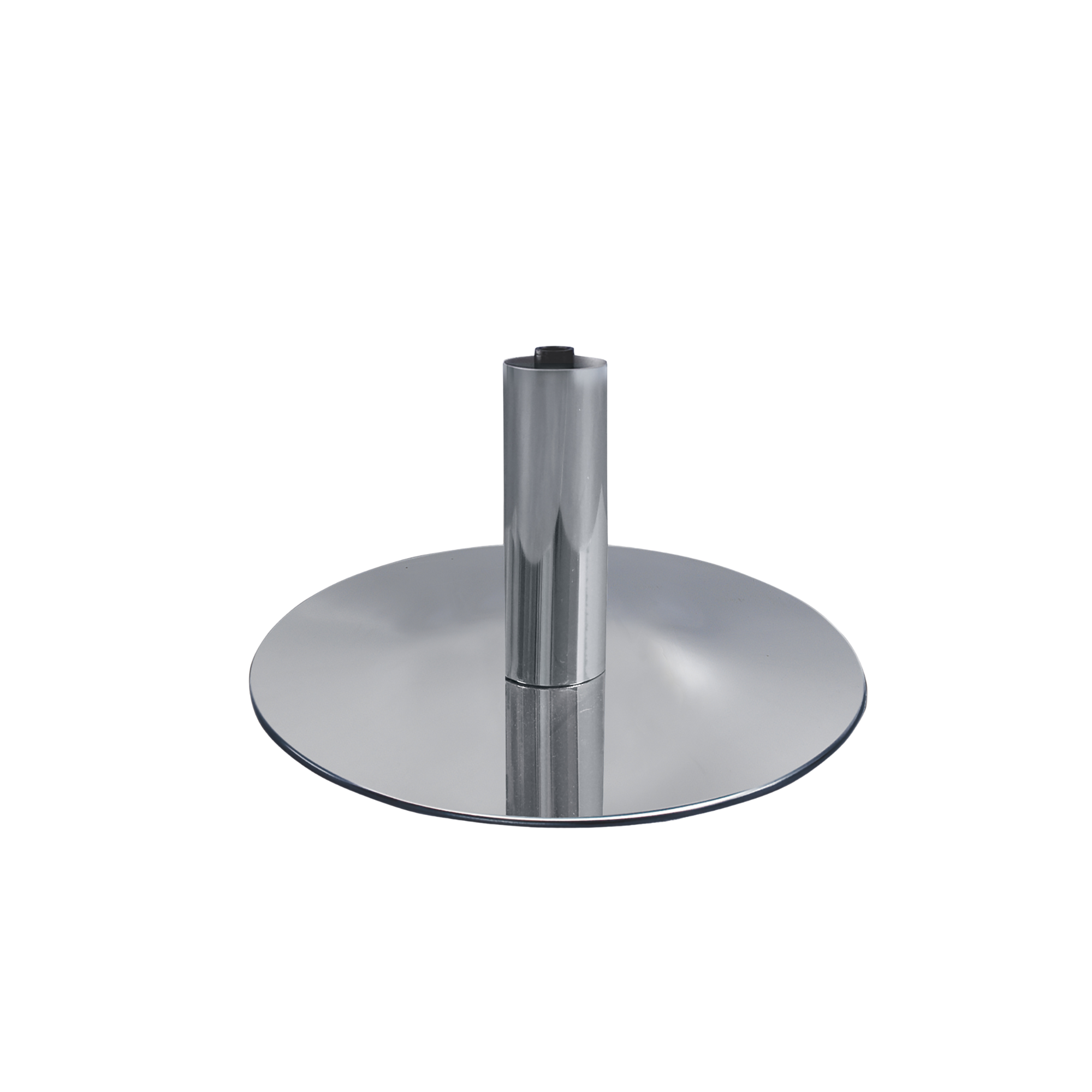 Okrugla baza za frizersku stolicu izrađena od sjajnog čelika s osovinom od kromiranog metala. Izdržljiva i elegantna, idealna za moderne frizerske salone koji traže pouzdanu i estetski profinjenu podlogu.