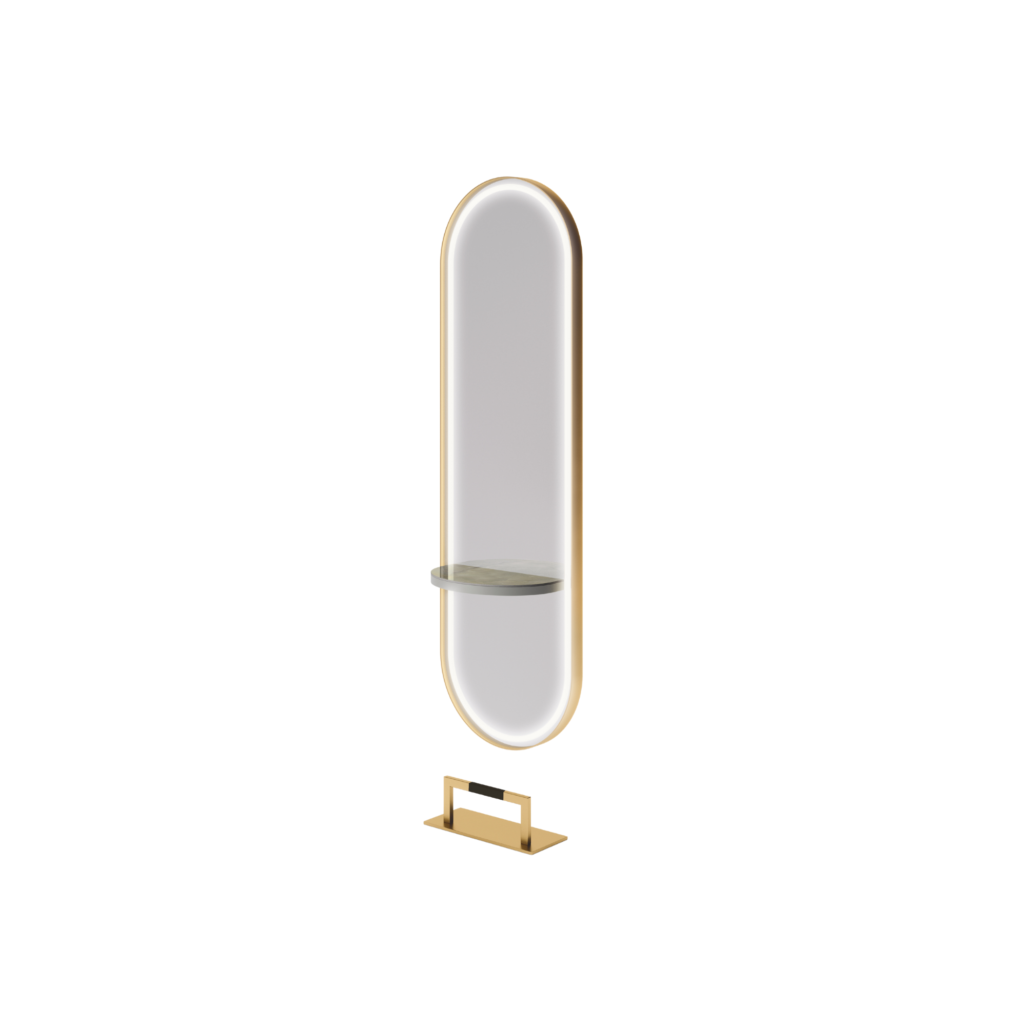 Radno mjesto Fancy zidna je frizerska stanica iz istoimene kolekcije, dizajnirana da spoji luksuz, eleganciju i funkcionalnost u jednom komadu namještaja. Ogledalo je uokvireno čeličnim okvirom u zlatnoj boji, s LED pozadinskim osvjetljenjem i profinjenim pjeskarenim detaljima koji stvaraju sofisticiran vizualni efekt.