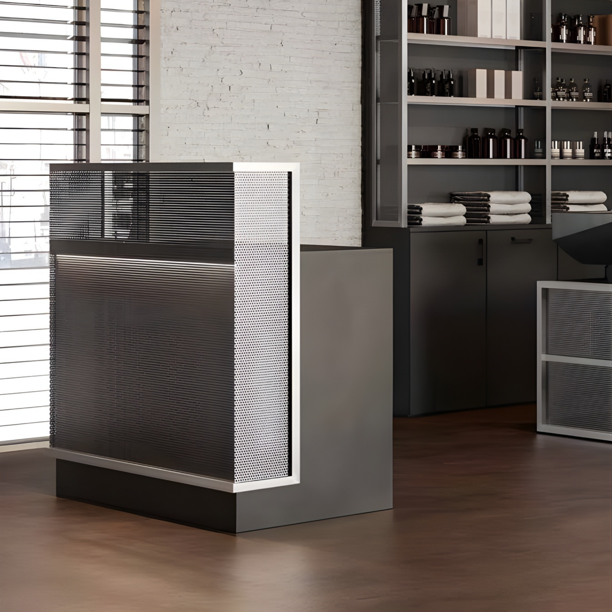 Poseban naglasak čini prednji panel s LED rasvjetom, koji dodatno ističe industrijski karakter i daje prostoru suvremeni, profinjeni izgled. Zahvaljujući spoju metalnih elemenata, svjetlosnih detalja i minimalističkog dizajna, recepcija Iron unosi dozu luksuza i moderne estetike u svaki frizerski ili beauty salon.