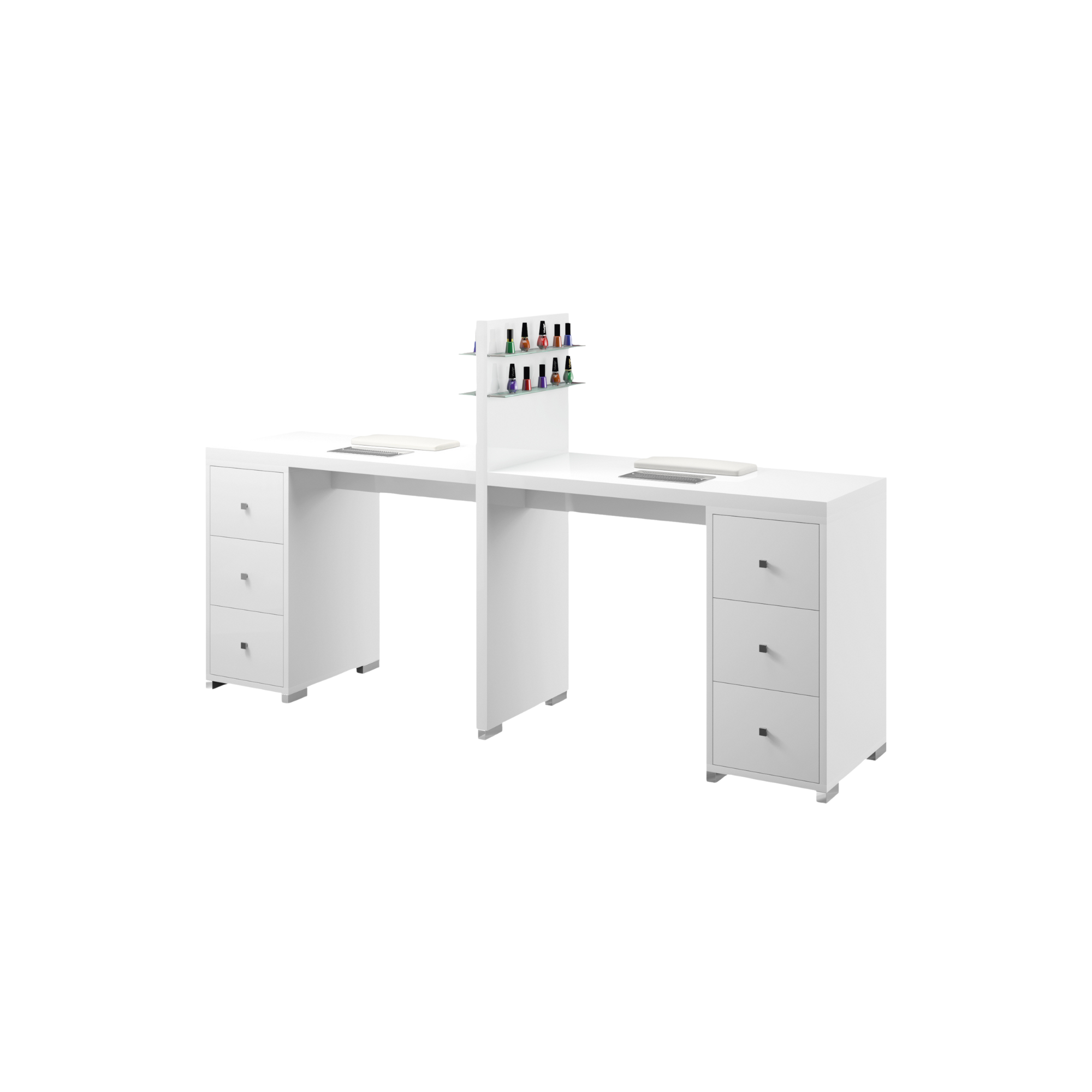 Stol za manikuru Grace Double dvostruki je stol sa središnjim stalkom za lakove. Odlikuje se staklenim policama, bijelom melaminskom konstrukcijom te ugrađenim ladicama, usisavačima i naslonima za ruke.